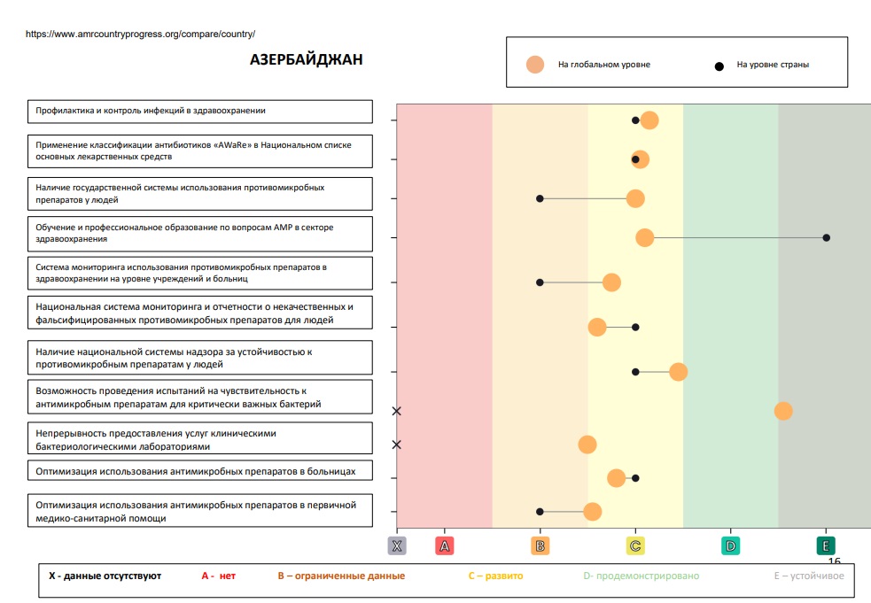 Система контроля над антимикробной резистентностью в Азербайджане находится на начальной и ограниченной стадии развития. По большинству ключевых показателей страна имеет оценки A (Нет) и B (Ограниченные данные), что указывает на отсутствие системной работы или наличие лишь отдельных, несвязанных инициатив. На текущий момент отсутствуют какие-либо развитые (C), продемонстрированные (D) или устойчивые (E) возможности.
