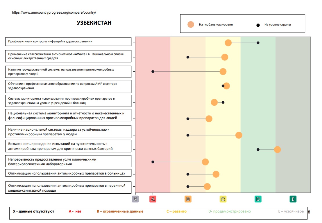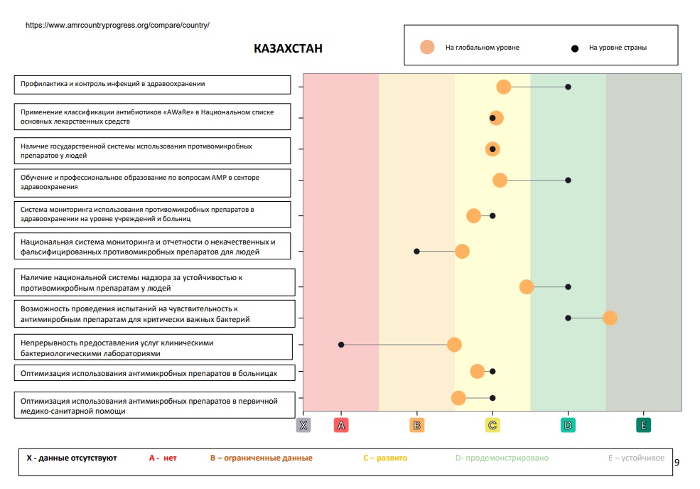 Как видим, система контроля над антимикробной резистентностью в Казахстане находится в стадии активного развития, демонстрируя прогресс по ряду ключевых направлений. Страна имеет смешанную картину: от полного отсутствия возможностей по некоторым пунктам до развитых и даже продемонстрированных — по другим. Это указывает на избирательный и, возможно, поэтапный подход к построению системы.