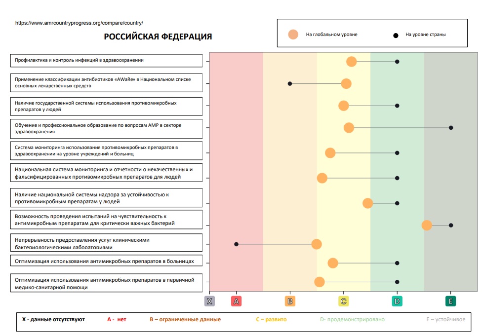 Российская Федерация демонстрирует развитую и частично продемонстрировавшую систему контроля над антимикробной резистентностью. По большинству ключевых показателей страна находится на уровнях C (Развито) и D (Продемонстрировано), что указывает на наличие работающей инфраструктуры и реализованных программ. Однако отсутствие наивысшего уровня E (Устойчивое) по всем пунктам говорит о том, что система еще не достигла полной интеграции и саморегулируемости.