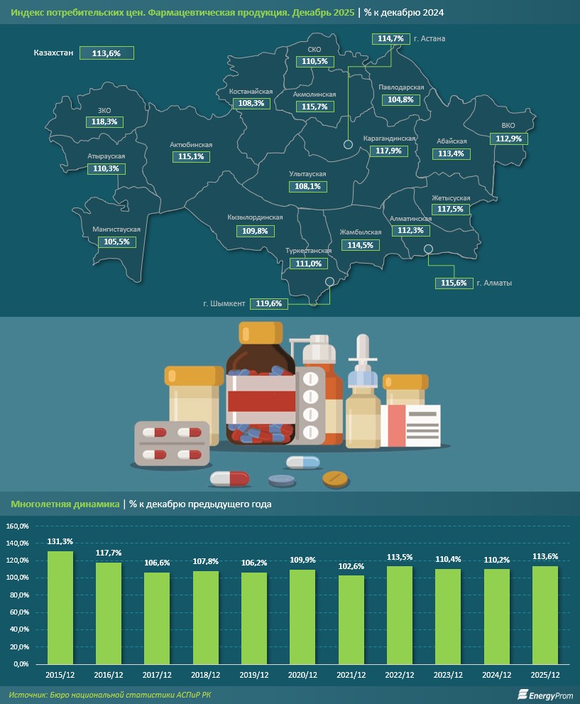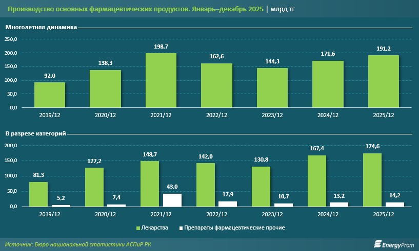 Производство фармацевтических продуктов за январь–декабрь 2025 года составило 191,2 млрд тг, что стало самым высоким показателем за последние четыре года. За год объём выпуска увеличился на 11,4% по сравнению с аналогичным периодом 2024-го, при этом с учётом инфляции рост составил лишь 1,9%.
