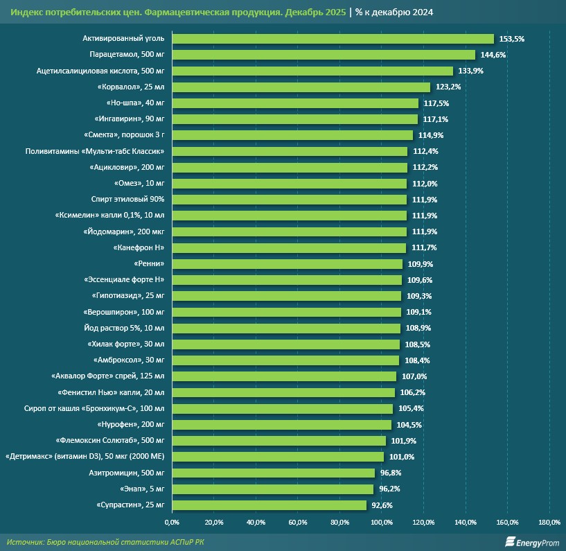 Наиболее заметное удорожание по итогам декабря прошлого года было зафиксировано по социально чувствительным и широко потребляемым препаратам. «Корвалол» вырос в цене более чем на 23,2%, ацетилсалициловая кислота — на 33,9%, парацетамол — на 44,6%, а активированный уголь — более чем в полтора раза. Эти позиции формируют наибольший инфляционный эффект для населения, поскольку используются массово и регулярно, а их удорожание напрямую отражается на потребительском восприятии цен в аптечном сегменте.