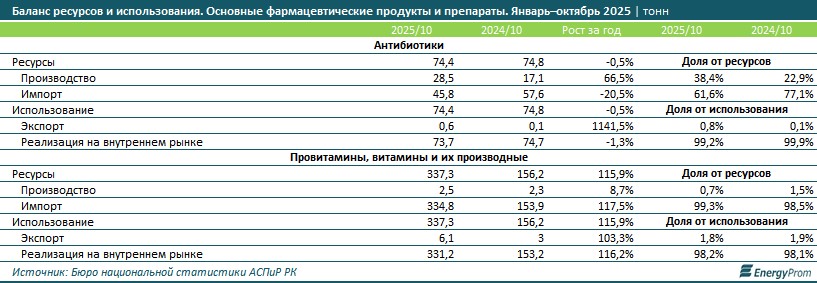 В категории провитаминов, витаминов и их производных ситуация принципиально иная. За январь–октябрь 2025 года их производство составило лишь 2,5 тонны — на 8,7% больше, чем годом ранее. Отечественные фабрики обеспечили спрос на них лишь на 0,7%, против 1,5% за январь–октябрь 2024-го. Импорт увеличился более чем в 2 раза, достигнув 334,8 тонн. Экспорт также вырос вдвое, но лишь до 6,1 тонны. Реализация провитаминов, витаминов и их производных на внутреннем рынке достигла 331,2 тонны, увеличившись за год в 2,2 раза. В целом сегмент характеризуется взрывным ростом объёмов при крайне низкой роли отечественного производства, что резко контрастирует с динамикой в категории антибиотиков и подчёркивает структурный перекос в развитии фармацевтической промышленности.