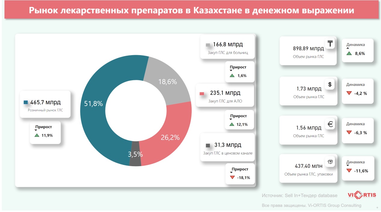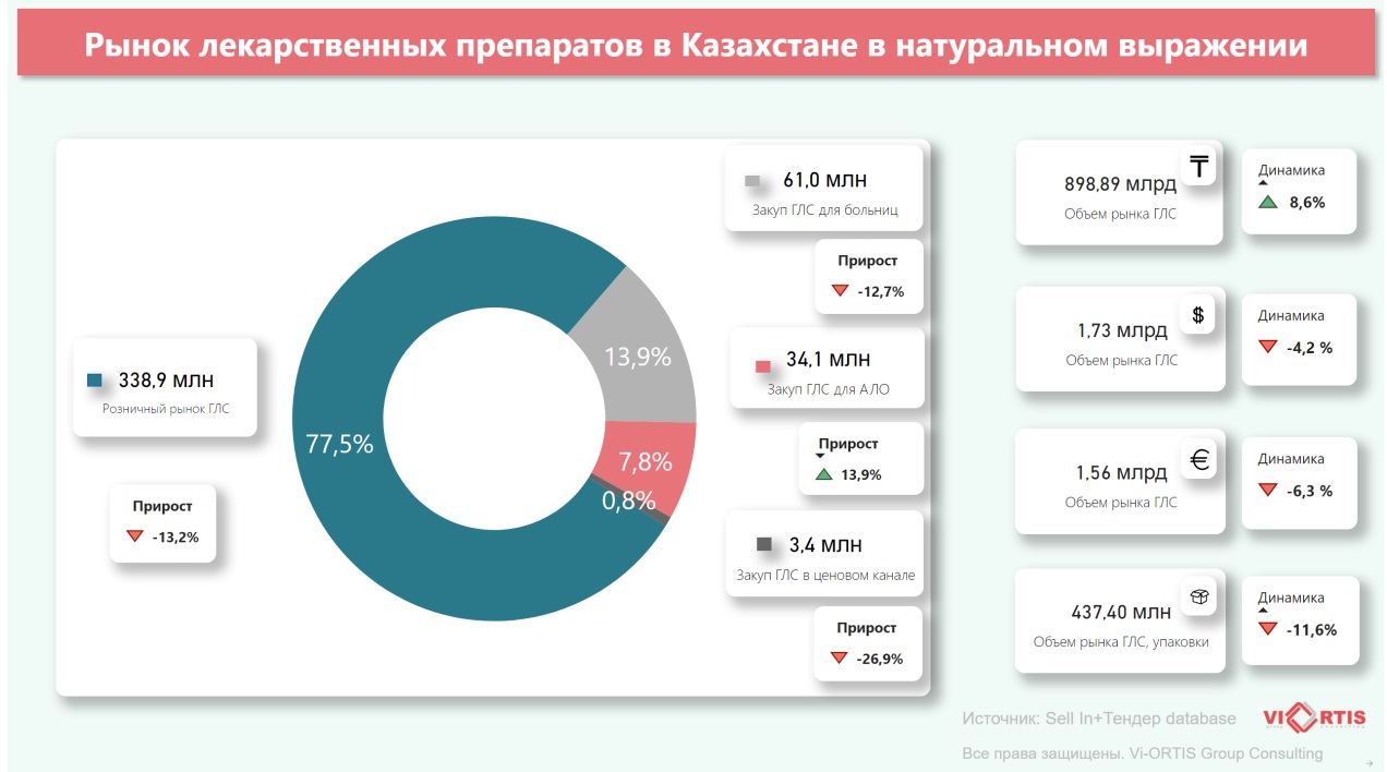Согласно данным аудита фармацевтического рынка Казахстана, который провела аналитическая компания Vi-ORTIS, розничный рынок готовых лекарственных форм по итогам 9 месяцев 2025 года составил 898,89 млрд тенге, показав прирост на 8,6%. В иностранной валюте динамика отрицательная: 1,73 млрд долларов США (- 4,2%); 1,56 млрд евро (-6,3%). Отметим также падение рынка в натуральном выражении: 437,4 млн. упаковок, то есть -11,6% по сравнению с прошлым годом.