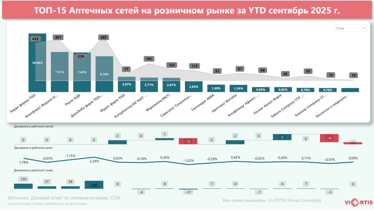 По данным на конец сентября в Казахстане было представлено уже порядка 9324 аптек, 4556 из этого списка представляют сетевые, 4158 индивидуальные, 610 оставшихся – государственные. Как показывают аналитические данные, лидирующие аптечные сети (ТОП-15) управляют больше половины всех сетевых аптек страны (2384 против 4556 аптек). В рейтинге аптечных сетей 4 первых позиции остались неизменными. Лидерство также удерживает ТОО «Зерде Фарма», насчитывающая 412 дверей, +120 по сравнению с прошлым годом, с долей 10,98% (+1,78 %). На втором месте закрепилась группа компаний «Биосфера»/«Формат.KZ»/«Долголет». С долей 7,51 % (-0,03%) сеть насчитывает сегодня 457 дверей, + 57 год к году. На третьем месте компания «Рауза-АДЕ» с долей 7,42% (+1,15%), 218 дверей, +58 новых точек. На четвертом месте ДжиЭнКа фарм ТОО/«Аптеки со склада». Доля 6,7% (+2,29%), 485 дверей, за 9 месяцев впечатляющий прирост составил 189 дверей. На пятое место с седьмого поднялась компания ТОО «Мурат Фарм» - доля 2,87% (+0,02%) 77 дверей.