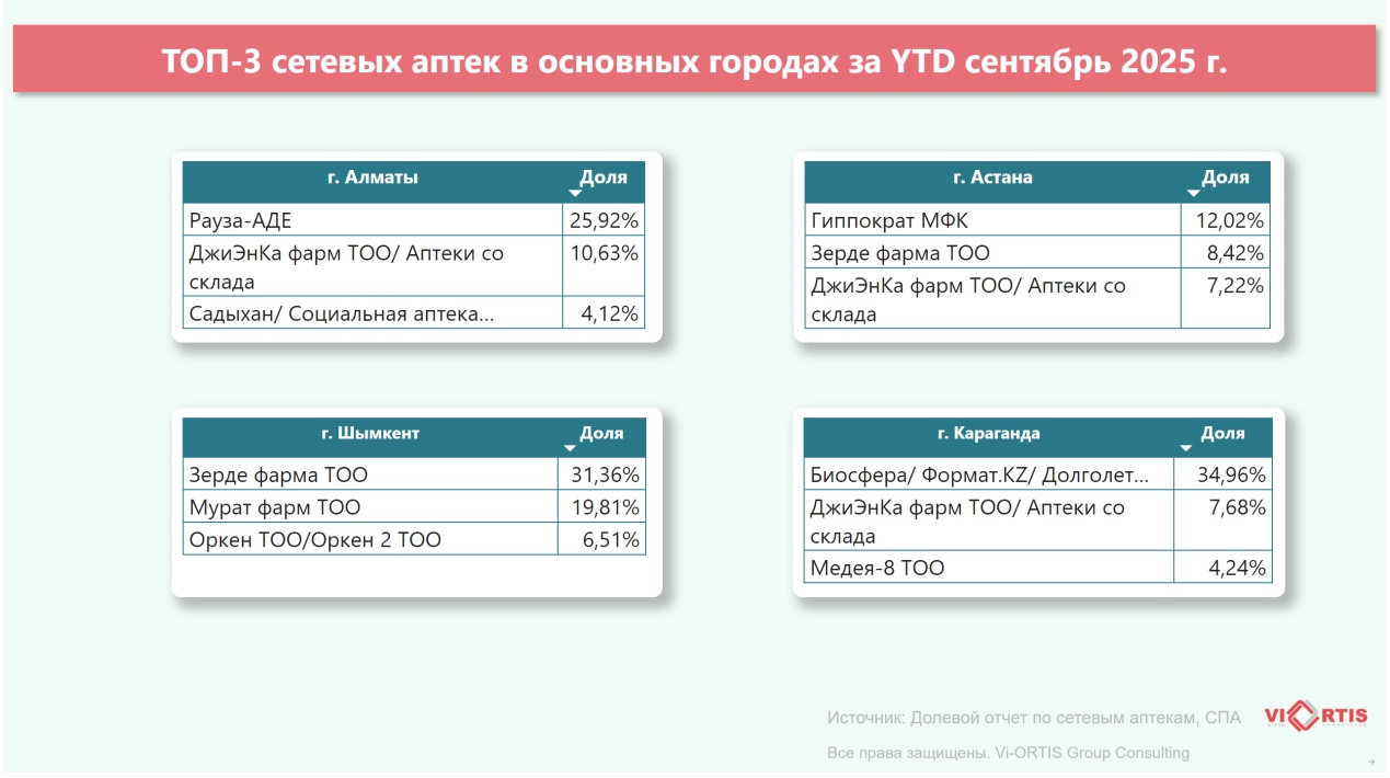 Таким образом, фармацевтический рынок Казахстана в 2025 году демонстрирует противоречивую динамику: рост в денежном выражении сопровождается сокращением объёмов продаж в упаковках и усилением структурных дисбалансов. Инфляционное давление, изменение потребительского поведения и регуляторные факторы продолжают трансформировать рынок, смещая фокус в сторону крупных аптечных сетей и усиливая процессы консолидации. Региональные различия в структуре аптечной розницы сохраняются, однако в целом сетевой формат уверенно укрепляет свои позиции практически во всех ключевых городах страны.