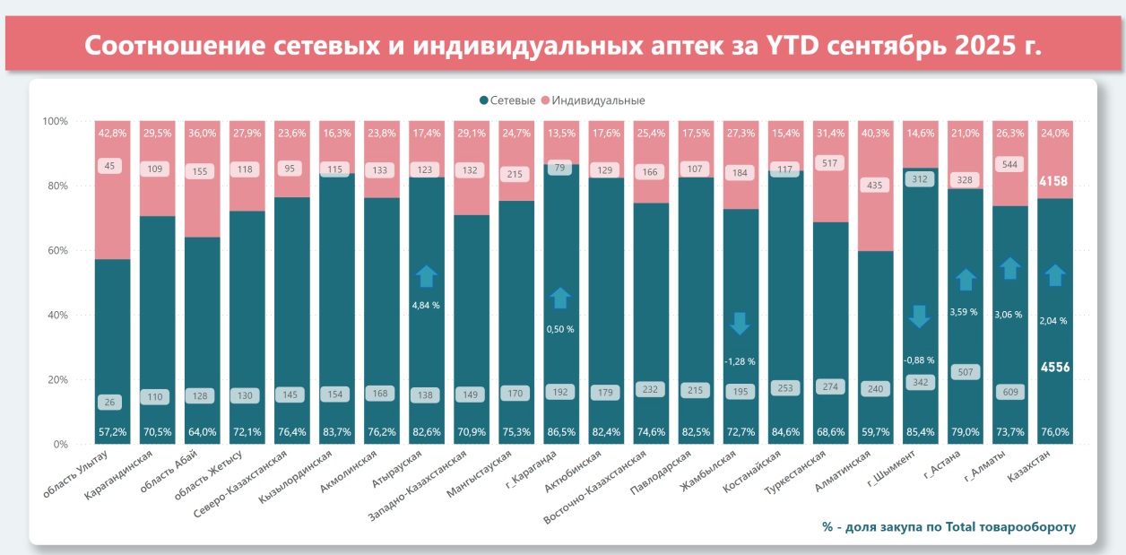 Данные доли закупа по Total товарообороту показывают 76% (+2,04%) за сетевыми аптеками, что демонстрирует их доминирование и тенденцию к консолидации. Самый большой темп прироста доли сетевых аптек в Атырауской области: +4,84%, что составляет в целом 82,6%. Крупные города продолжают показать динамику роста закупа сетевых аптек: Астана +3,59%, 79% в целом, Алматы +3,06%; 73,7% в целом, и Караганда +0,5%; 86,5% в целом. Есть и отрицательные показатели – Жамбылская область показала достаточно значительный темп снижения на 1,28% (72,7%), а город Шымкент снизился на 0,88% (85,4%).