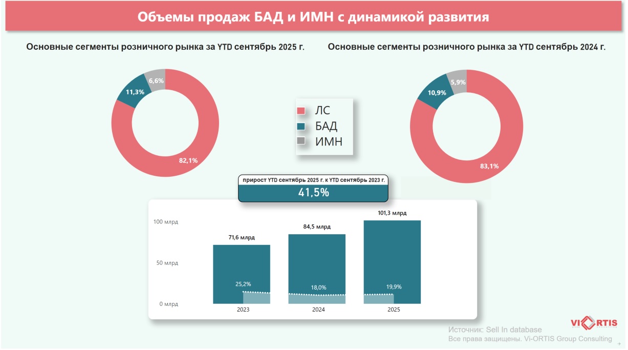 Аналитическое агентство Vi-ORTIS подготовило комплексный обзор рынка БАД, основанный на системном анализе розничных продаж, динамики потребительского поведения и структуры аптечного ассортимента. На диаграммах хорошо видно, что доля лекарственных средств постепенно снижается – на данный момент она составляет около 82%. Параллельно растёт доля медицинских изделий и БАД: 11,3% занимает сегмент БАД и 6,6% – изделия медназначения. Этот сдвиг говорит о трансформации спроса и постепенном смещении интереса потребителей к профилактическим и поддерживающим продуктам.