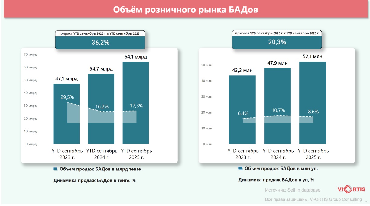 Самые высокие темпы роста показывают премиальные БАД стоимостью свыше 25 тысяч тенге: более 123% в деньгах и 149% в упаковках. Это говорит о расширении аудитории, готовой инвестировать в высокосегментные продукты здоровья.