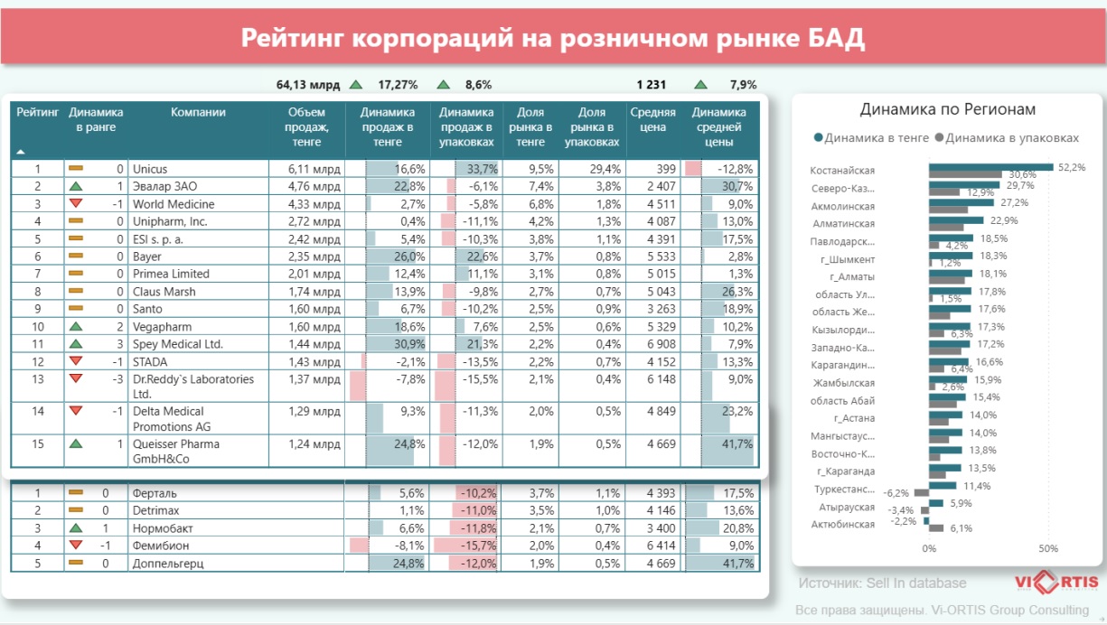 Темпы роста: +31% в деньгах, +21% в упаковках. Особенно в портфеле корпорации выделяется бренд Фертилайф, укрепляющий позиции: +70% в деньгах, +67% в упаковках. Рост компании объясняется активным продвижением нишевых БАД гормонального и репродуктивного профиля, а также успешной региональной экспансией. Лидером по темпам стала Кызылординская область +309% в деньгах. В упаковках лидирует Северо-Казахстанская область – более +200%. Высокую динамику также показывают: Костанайская, Карагандинская, Восточно-Казахстанская, Атырауская области. Корпорация демонстрирует уверенную, системную работу и дальнейший потенциал роста.