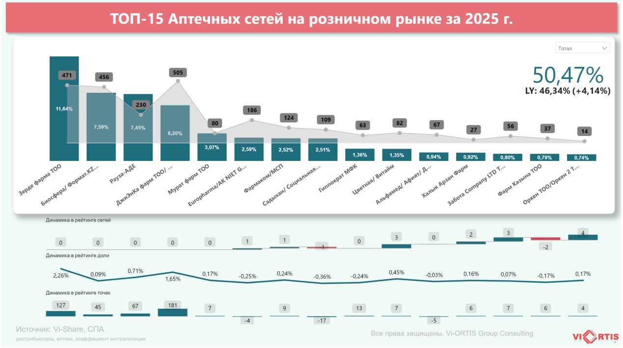 По итогам 2025 года ТОП-15 аптечных сетей сосредоточили в своих руках более половины всех сетевых аптек страны - 2507 из 4522 точек. Совокупная доля продаж крупнейших сетей составила 50,47% от общего оборота розничного фармацевтического рынка, что свидетельствует о продолжающейся консолидации.