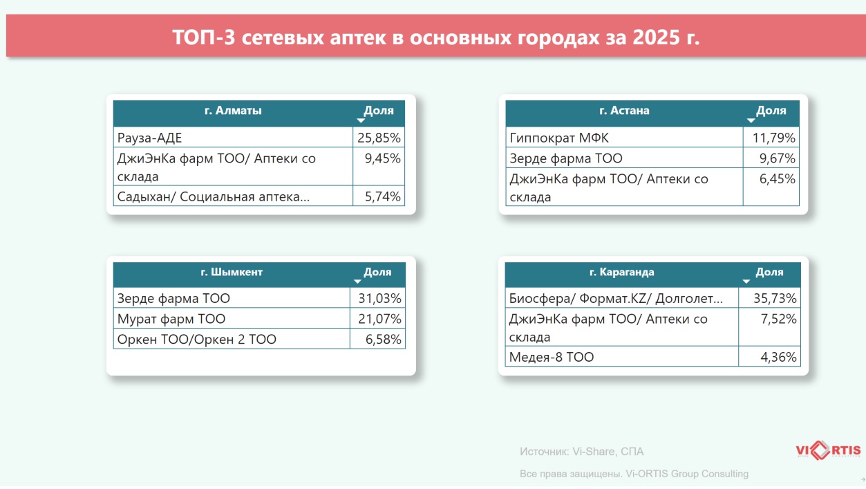 В Алматы лидирует сеть «Рауза Аде» с долей 25,85% (25,71% в 2024 году). Далее следуют «ДжиЭнКа фарм / Аптеки со склада» - 9,45% (9,27%) и «Садыхан» - 5,74% (7,33%).
