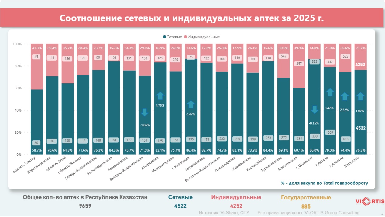 В целом по стране насчитывается 4522 сетевые аптеки (4209 в 2024 году) и 4252 индивидуальные (4324 в 2024 году). Доля закупа по total товарообороту составляет 76,3% (+1,97%) за сетевыми аптеками против 23,7% у частных.