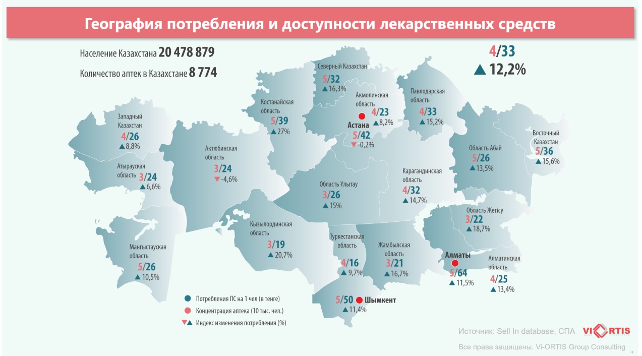 В Астане первое место занимает «Гиппократ МФК» - 11,79% (13,61%). На втором месте - ТОО «Зерде Фарма» с долей 9,67% (в 2024 году ТОО «Саламат Фармация» 6,4%), на третьем - «ДжиЭнКа фарм / Аптеки со склада» - 6,45% (5,89%).