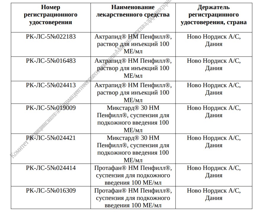 Приказом № 491-НҚ от 05.11.2025 Комитет медицинского и фармацевтического контроля МЗ РК отзываются регистрационные удостоверения ряда лекарственных средств согласно приложению к настоящему приказу. Основание: Обращение Товарищества с ограниченной ответственностью «Ново Нордиск Казахстан» №ЗТ-2025-03560764 от 10 октября 2025 года.
